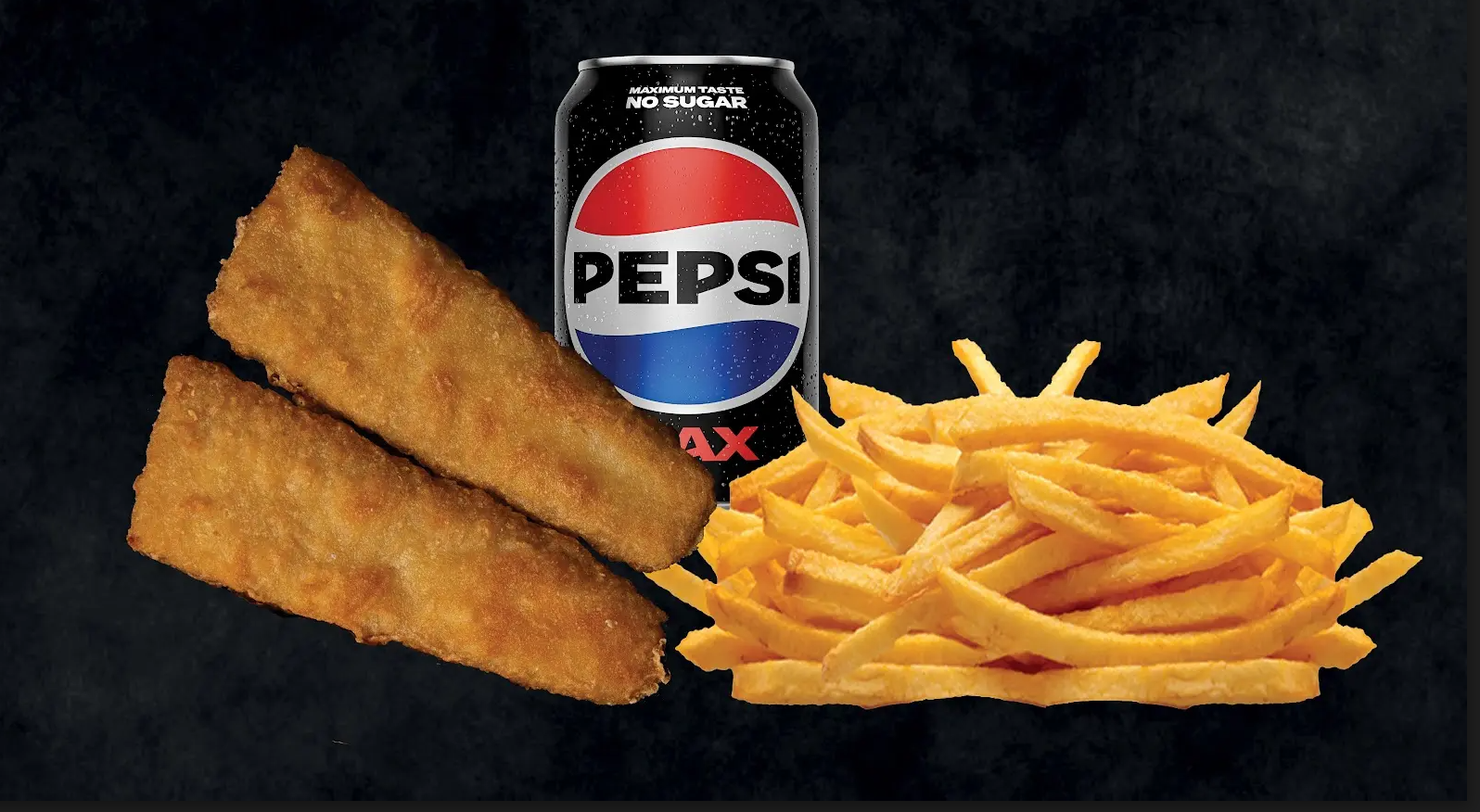 2 stk fish`n chips, pommes & 0,33 l sodavand